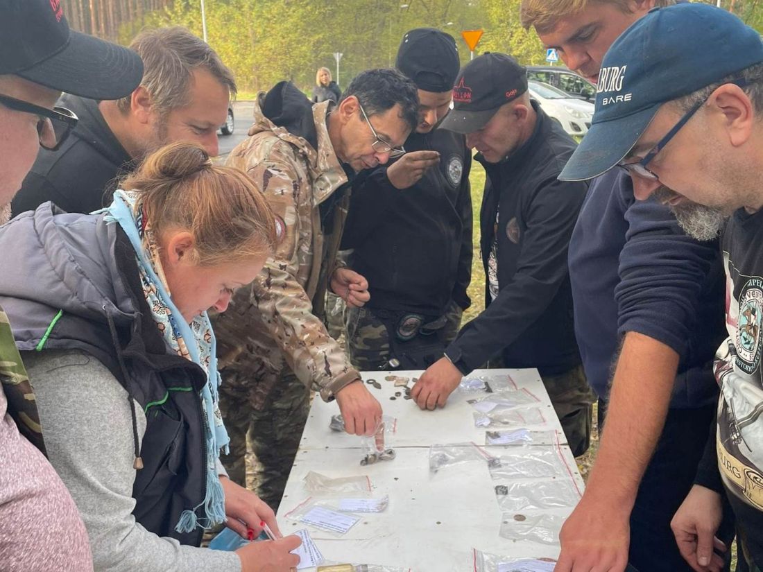 Da die Anzahl der Museumsmitarbeiter begrenzt ist und nur zwei von ihnen geschult sind, einen Metalldetektor zu bedienen, war externe Unterstützung erforderlich. Immerhin umfasst dieser von uns untersuchte Teil des Lagergeländes eine Fläche von ca. 25 ha. Wie üblich konnten wir auf die Hilfe unserer befreundeten Teams zählen: Verein „Bastion Eksploracja Poszukiwania“ aus Küstrin/Kostrzyn, Geschichts- und Kulturverein aus Tempelburg/Czaplinek und weitere ihnen nicht angeschlossene Freiwillige. An der Suche beteiligten sich auch Vertreter der Zeitschrift „Odkrywca“ gemeinsam mit der Präsidentin des Verlags „Institut für Geschichts- und Landesforschung“ Magdalena Haber. Insgesamt erschienen innerhalb von zwei Tagen etwa 40 Personen im Lager, für die das Festungsmuseum warme Mahlzeiten bereitstellte. Während der zweitägigen Suche entdeckten wir gemeinsam viele interessante Artefakte zur Geschichte dieses Ortes (insgesamt 70 Funde, Schrott aber nicht eingeschlossen). Sie werden jetzt ausführlich beschrieben und dokumentiert. Schon jetzt können wir verraten, dass die wertvollsten Funde neben Lagerutensilien und Häftlingsausrüstungen die Erkennungsmarken französischer und italienischer Häftlinge sind. Erwähnt werden muss auch, dass wir am ersten Tag unerwarteten Besuch von vier Mitgliedern der Forstwache des Forstbezirks Neudamm/ Dębno hatten, die über die von einer großen Anzahl von Personen durchgeführte Suche im Wald alarmiert wurden. Nach der Übergabe der Genehmigungen lauschten die Förster interessiert den Informationen über unsere Arbeit und Funde. Wir sind sehr froh, dass die Einwohner von Küstrin so aufmerksam waren und dass die Forstwache dieses Signal nicht ignoriert hat. Denn leider sind ähnliche Objekte und Orte Plünderern und Erkundungs-Amateuren ausgesetzt, die trotz hoher Strafen Risiken eingehen und versuchen, illegal in archäologische Stätten einzudringen. Das Gebiet des Stalag III C erfordert eine großangelegte Forschung (einschließlich der Ausgrabungen). Vielleicht ergibt sich in einigen Jahren beim Bau einer Umgehungsstraße, deren geplante Trasse das Lager queren wird, die Gelegenheit dazu. Vorerst gehen wir kleine Schritte, die wir in den kommenden Jahren fortsetzen werden.