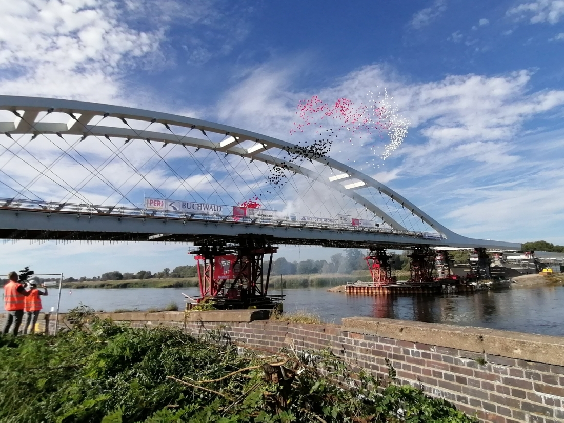 Dies war wohl das wichtigste Ereignis der seit zwei Jahren andauernden Bauarbeiten. Aus diesem Anlass lud die Geschäftsführung des ausführenden Unternehmens, der Sächsischen Bau GmbH, alle am Gelingen des Projekts Beteiligten, von den Planern über die Investoren (Deutsche Bahn), Bauunternehmer und Subunternehmer bis hin zu Vertretern von Behörden und kooperierenden Institutionen zu einem Treffen ein. Auch das Festungsmuseum Kostrzyn, vertreten durch den Direktor Ryszard Skałba, war in dieser hochkarätigen Runde vertreten. Unsere guten Beziehungen wurden bei einer Führung durch die Altstadt und das Museum, an der zunächst die Mitarbeiter und dann die Unternehmensleitung teilnahmen, geknüpft, die wiederum in der Übergabe eines Fragments der abgebauten alten Brücke an unsere Bestände mündete. Am Richtfest nahm auch unser Freund, der bis 1945 in Kostrzyn lebte, teil: Klaus Thiel aus Berlin, der einige Geschichten im Zusammenhang mit den Kostrzyn-Brücken vortrug. Der Einschub der Brücke wurde auch von einer großen Gruppe interessierter polnischer und deutscher Bürger verfolgt, die sich auf der benachbarten Straßenbrücke aufstellten.