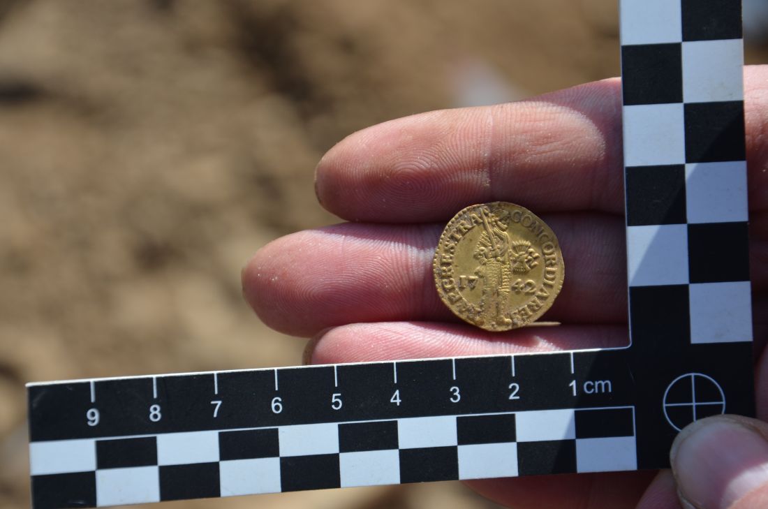 Außerdem fanden sich ein Siegel und zwei Münzen. Nur eine von ihnen, ein holländischer Gold-Dukat aus dem Jahre 1742 - wurde bisher identifiziert. Er wurde in der Nähe des Beckens eines der Soldaten gefunden, was darauf hindeuten könnte, dass er -verschluckt worden war und sich in den Eingeweiden des gefallenen Soldaten befand (es wurden keine Materialspuren gefunden). Die zweite Münze, mit einem Durchmesser von ca. 32 mm, ist eine Silbermünze, deren Identifikation derzeit nicht möglich ist. Neben den beiden oben genannten Forschern waren auch Mitarbeiter der Abteilung Anthropologie der Universität für Lebenswissenschaften in Breslau und der Abteilung für forensische Genetik der Pomorski Uniwersytet Medyczny (Pomeranian Medizinische Universität ) in Stettin, sowie Freiwillige aus den mit uns zusammenarbeitenden Verbänden beteiligt. An dieser Stelle möchten wir dem Eigentümer des Grundstücks danken, der die geeigneten Schritte unternahm, um sich mit den entsprechenden Museen in Verbindung zu setzen und so die Recherche überhaupt erst zu ermöglichen.