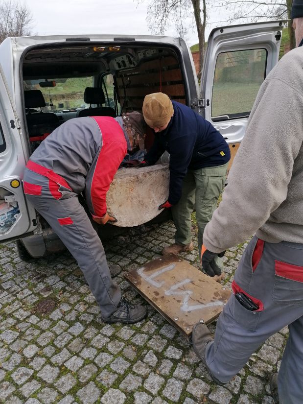 Leider wurden die Krypten 1945 erneut geplündert. Archäologische Untersuchungen aus dem Jahr 1999 erbrachten Katharinas Sargdeckel (der restauriert im Berliner Tor präsentiert wurde - derzeit in der Ausstellung in der Stadtbibliothek in Dębno/Neudamm ausgeliehen) und einen der Sockel, auf denen beide Sarkophage standen. Vor einigen Monaten entdeckten Mitarbeiter des Festungsmuseums bei Erkundungsarbeiten in der zerstörten Krypta drei weitere Sockel in den Trümmern. Da immer wieder Unbefugte in die Krypta eindringen, beschlossen wir mit Zustimmung des Priesters der römisch-katholischen Pfarrei der Heiligen Jungfrau Maria, Mutter der Kirche (Besitzerin der Altstädter Ruine), Pater Dr. Prälat Wojciech Skóra, die Sockel vor möglichen "Verlusten" zu bewahren. Gestern (am 20. Januar) wurden sie aus der Krypta geholt und zur Bastion Philip transportiert. Nach entsprechender Reinigung werden sie auf unserer Ausstellung in einem kompletten Set präsentiert.