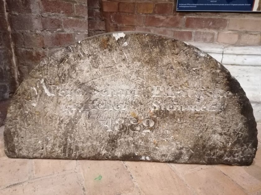 In Zusammenarbeit mit dem ehemaligen Einwohner von Küstrin Klaus Thiel aus Berlin und einem Mitglied des Vereins für die Geschichte Küstrins aus Küstrin-Kietz, Andy Steinhauf aus Frankfurt, konnte die Inschrift auf der Unterseite eines der Sockel entschlüsselt werden (dies sind die Namen des Vorgesetzten und des Steinmetzes). Dies ist unser nächster Fund, der unsere Ausstellung bereichert, und wir glauben, dass es nicht der letzte sein wird. Wir lieben solche Überraschungen.