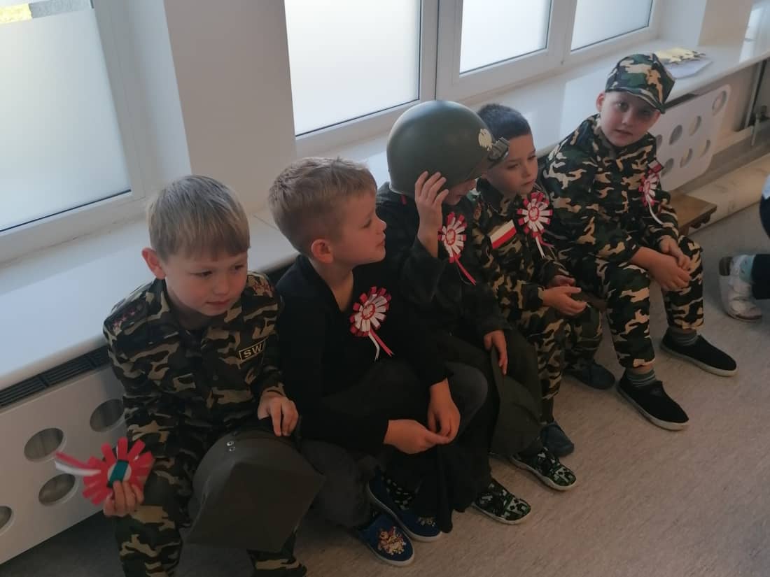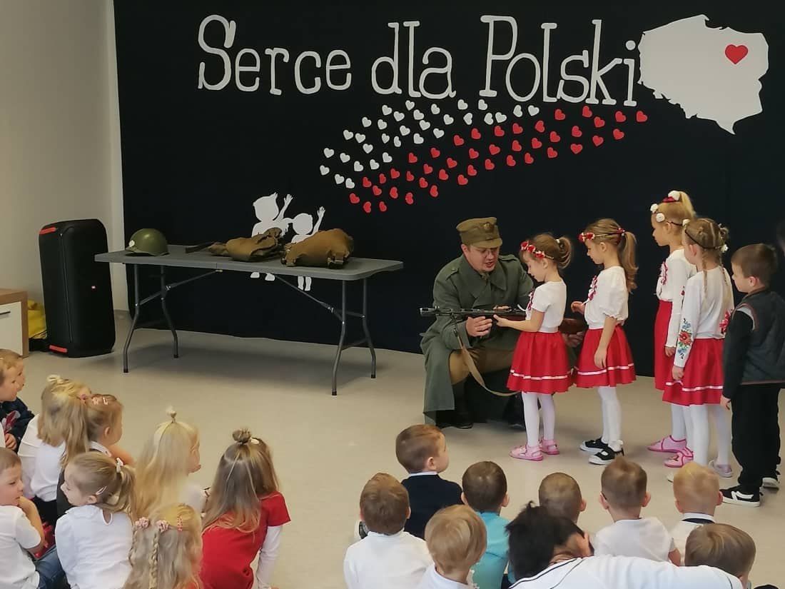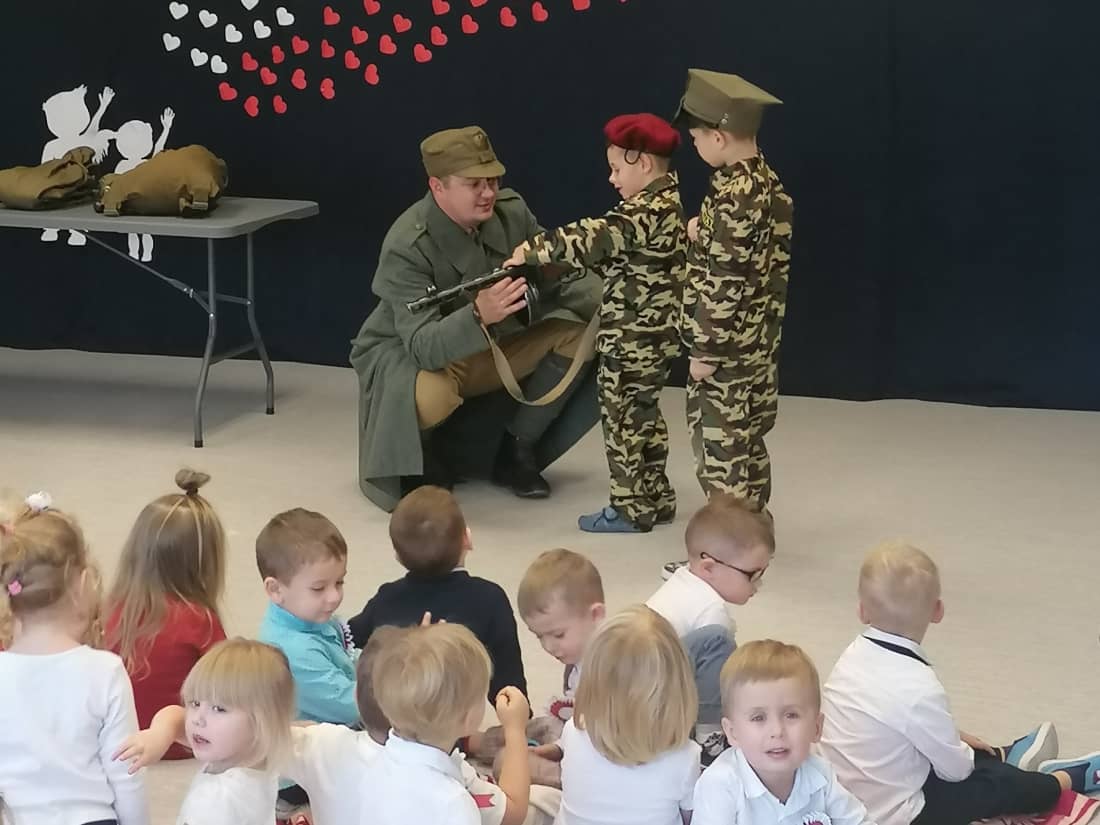 Odświętnie ubrane przedszkolaki z biało-czerwonymi kotylionami na piersi z dumą odśpiewały hymn państwowy. Gościem specjalnym uroczystości był Rafał Górecki, pracownik Muzeum Twierdzy Kostrzyn, który opowiedział dzieciom o polskich symbolach narodowych oraz o historii odzyskania niepodległości. Jak zwykle ogromne zainteresowanie wzbudziły eksponaty, które przyniósł ze sobą – elementy umundurowania i wyposażenia żołnierskiego. Dzieci z ciekawością oglądały pamiątki, mogły je przymierzać i zadawać pytania. Co sprytniejsi ustawiali się w kolejce po kilka razy. Niektórzy zaskoczyli wiedzą na temat broni czy symboli narodowych.